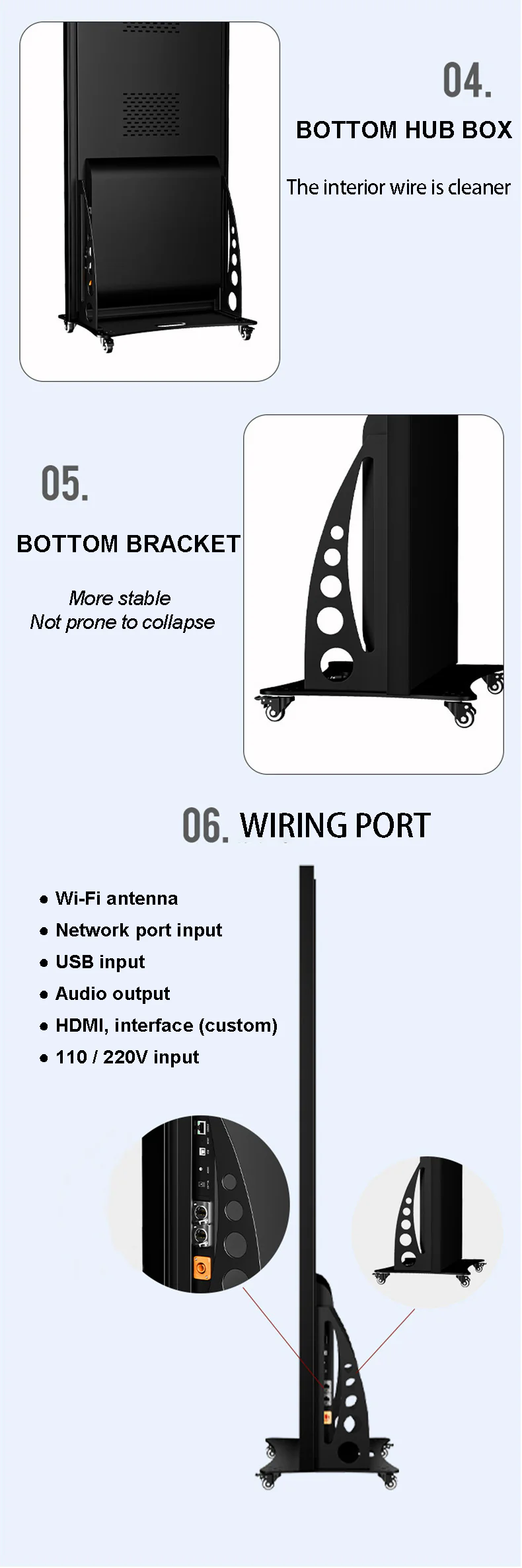 The net display size is 640mm * 1920mm, and the cabinet enclosure size is 652mm * 2008mm. This size combination is ingenious. The net display area can provide sufficient space to clearly and completely display various posters, promotional pictures, event details, and other contents. While ensuring the safety of internal components, the cabinet enclosure also adapts to the indoor environment without looking obtrusive. The overall proportion is harmonious. Whether it is placed in conference rooms, exhibition halls, shopping mall lobbies, schools, hotels, or other indoor places, it can blend naturally into the environment, attract people’s attention, and become a visual highlight in the indoor space.