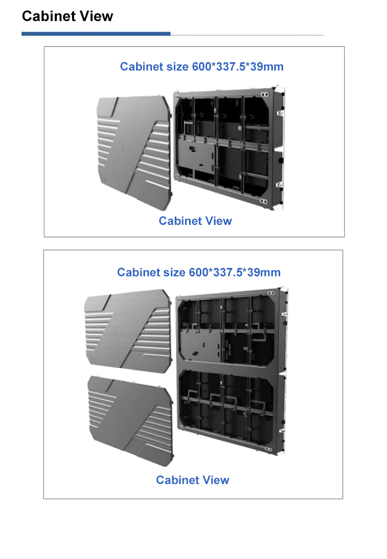 The cabinet size is set at 600 * 337.5mm, following the golden ratio of 16:9 that conforms to modern visual aesthetics and multimedia content adaptation. Such a design not only makes a single screen visually more harmonious and comfortable but also greatly facilitates the flexible splicing and combination of multiple screens in different indoor venues. According to factors such as the actual space size of the venue and the display layout requirements, seamless splicing can be easily achieved to create large-screen display areas of various sizes and shapes, perfectly adapting to diverse indoor environments such as conference rooms, exhibition halls, command centers, and studios, meeting the complex and diverse project display requirements and providing strong support for building personalized indoor display solutions. -